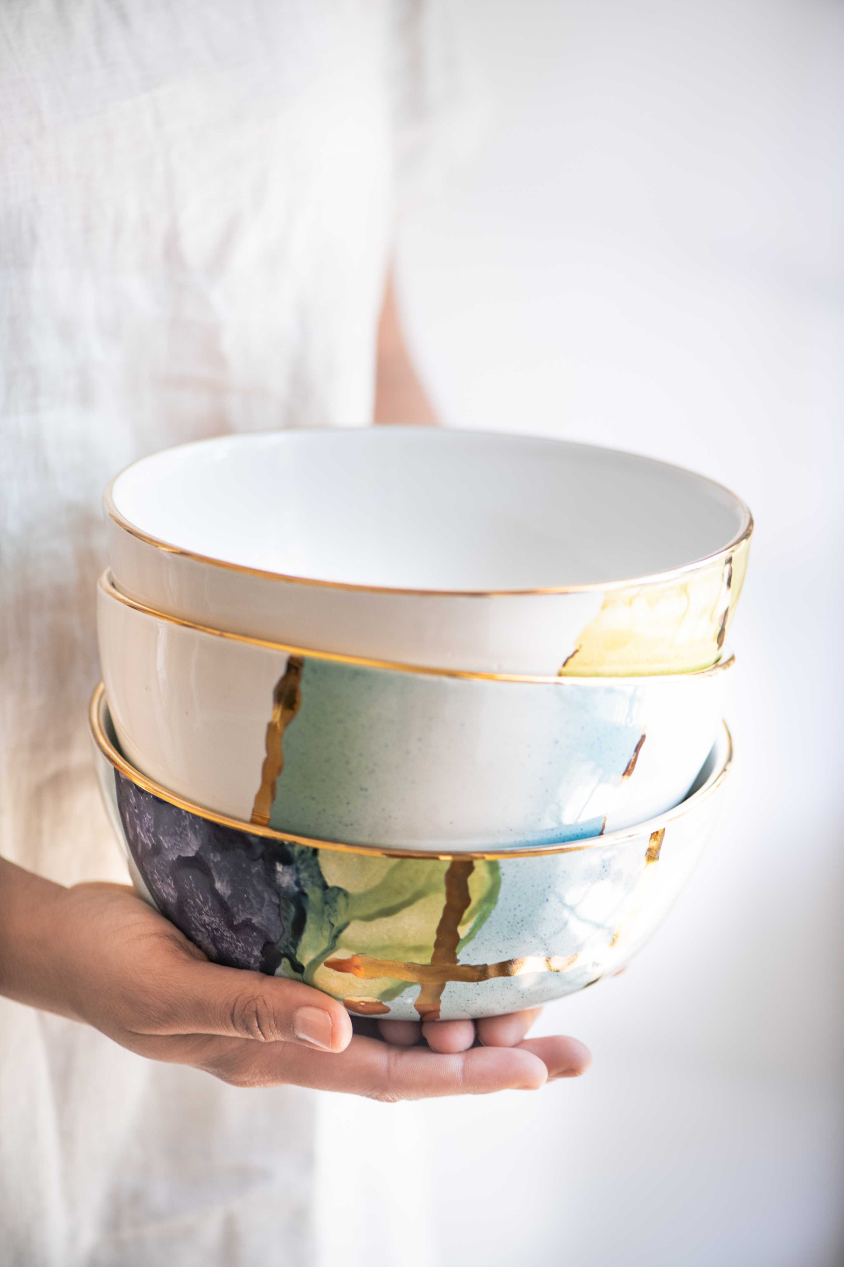Our pieces are designed to be used and cherished every day. They are safe to be put in the dishwasher for ease of use. Since most of the pieces are accented using 24 ct. gold, it is not advisable to use them with a microwave or an oven. As each piece is handmade, with many hours of work put into them, we ask that you treat them with care.